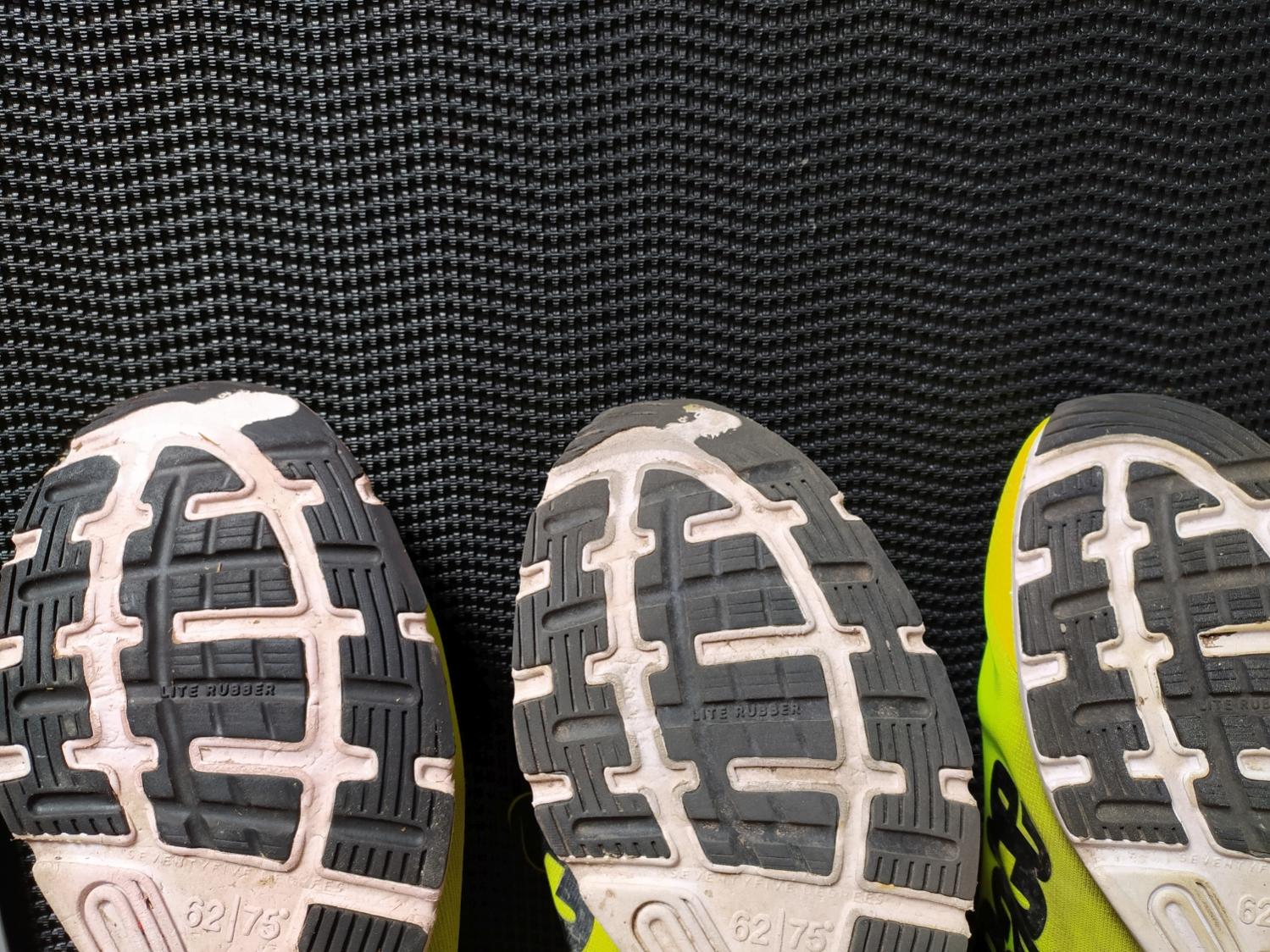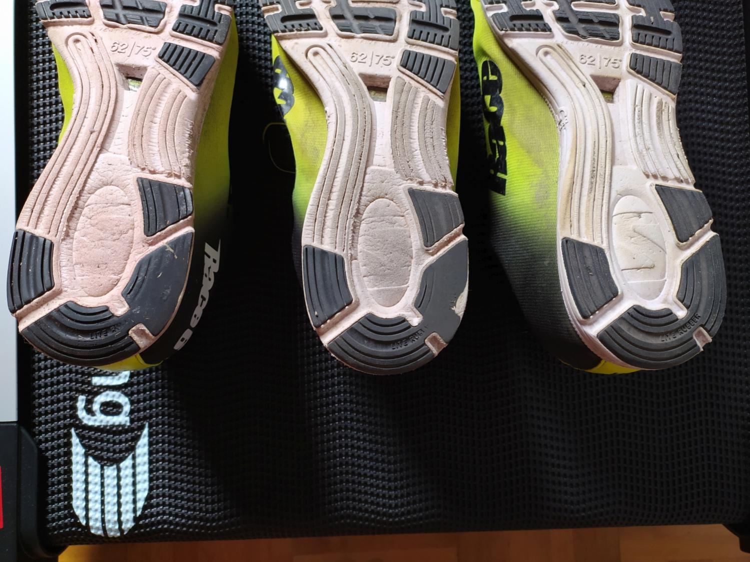 Aber nach deinem Bild würde ich sagen, dass die nach 200-300km spätestens fertig sind. Das Gummi vorne ist schon auf Level der Mittelsohle runter. Erste Abnutzung in dem Bereich wo man nur auf Mittelsohle läuft, sieht man auch.