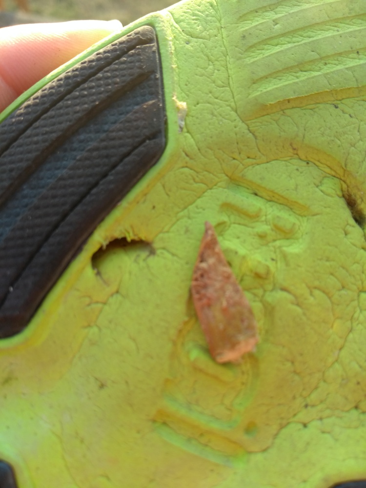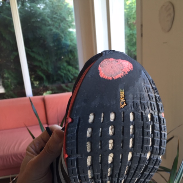 Mein erster Adios (ist danach noch etwas gelaufen bis recht Adios-typisch die mittlere Plastikverstärkung durchkam): Auch hier sieht man, dass ich außer-mittig abdrücke (Bild: rechter Schuh).