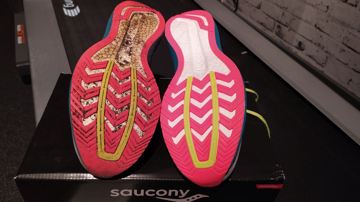 Optik: Ich finde die Saucony ok. Der Schuh selber wirkt sehr normal. AUf dem Bild ist der Pro mehr gespannt, da der mit einem Pappschuhspanner geliefert war. Die Ferse ist etwas minimalistischer und schon mehr WK-Schuh als beim Speed, aber sonst auch sehr moderat geschnitten.