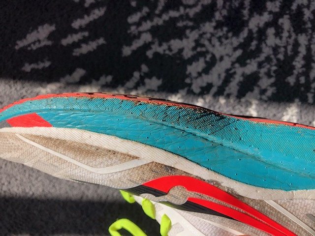 Hier mal noch der Rincon 2 (320km) mit reiner EVA Außensohle (der Mach4 hat ja dieses gummierte-EVA): und der Endorphin Speed bei ~500km. Bei dem sieht man eigentlich nur von der Außenseite, dass es dort entweder das Gummi in die Sohle reingedrückt hat oder es halt mittlerweile recht dünn ist. Aber schon krass, was der dünne Gummistreifen aushält:
