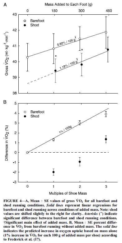 Das Laufen in Schuhen scheint einen Vorteil von ca. 3.5% im Sauerstoffverbrauch (=Laufökonomie) zu bringen. Dieser wird zumindest teilweise wieder ausgeglichen durch den Nachteil, dass Schuhe ein gewisses Gewicht haben und pro 100 g (je Fuß) der Sauerstoffverbrauch um grob 1% ansteigt. Bei einem Gewicht der meisten Wettkampfschuhe von 200-250 g macht dies also ca. 2-2.5% der "gewonnen" 3.5% zunichte.