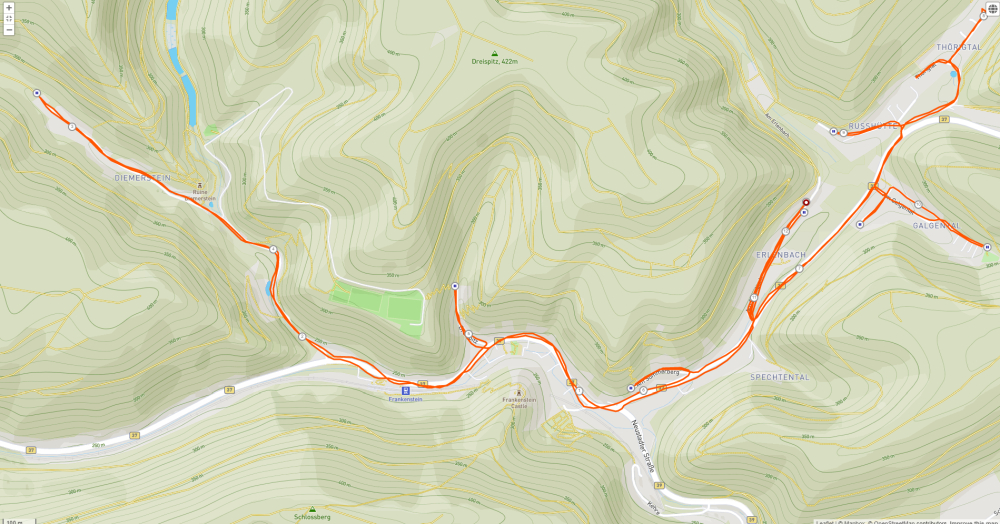 Für Tempo Einheiten habe ich zwei Hauptstrecke, sie kann ich dann auch jeweils ausdehnen/anpassen. Eine ist mit einem 4km Rundkurs, Weg dort hin ist das Ein- und Auslaufen. Lauf ich einmal die Woche, bei Langen mit EB ist eine der Strecken oft der Schlusspart.