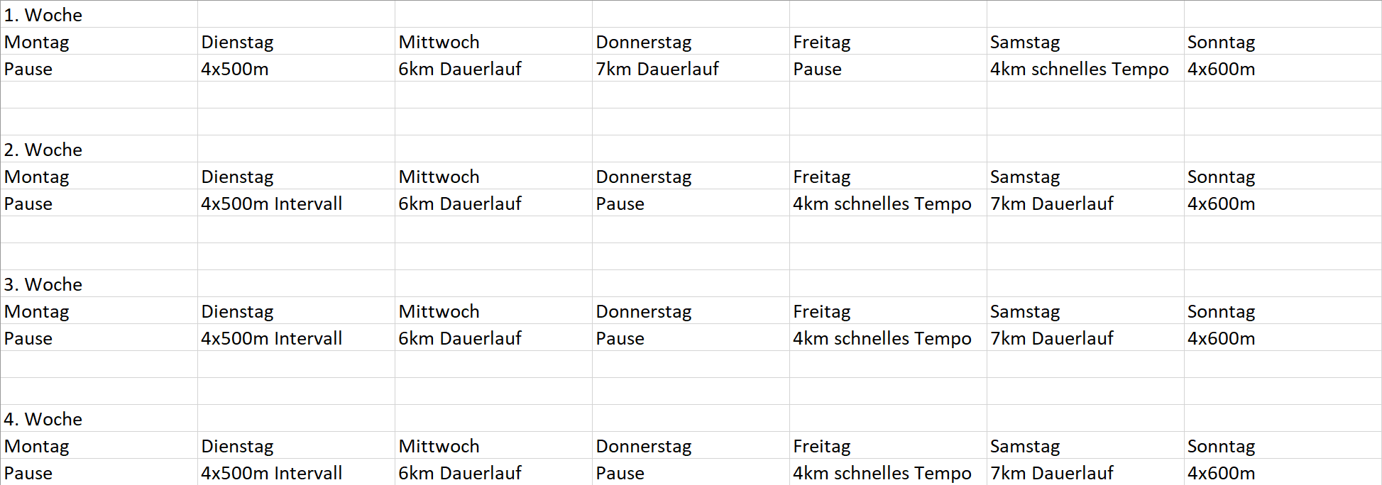 Ich muss für meine Sporteignungsprüfung 3000m in 13 Minuten laufen. Im Winter habe ich die Strecke in 14 Minuten geschafft und war seitdem unregelmäßig laufen nun sind noch 4 Wochen Zeit und ich habe mir ein Trainingsplan erstellt und wollte fragen ob der ok ist und ob das Ziel in 4 Wochen 30-60 Sekunden schneller werden realistisch ist. Zu mir vielleicht noch kurz ich bin 19 Nichtraucher und Spiele seid ich klein bin Fußball, jedoch leider im Tor weswegen meine Ausdauer nicht die beste ist.