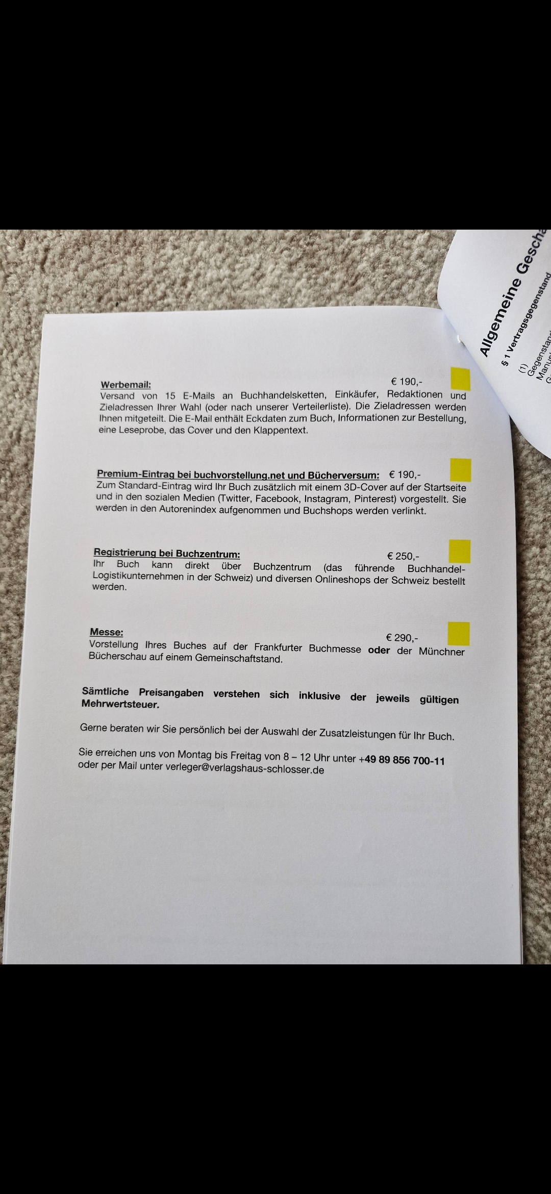 ich wäre vorsichtig mit solchen Verlagen, die ihrem Auftritt nach schlichtweg möglichst viele Pakete verkaufen wollen. Der Inhalt der Bücher und deren Verkaufsaussichten dürften denen ziemlich egal sein.