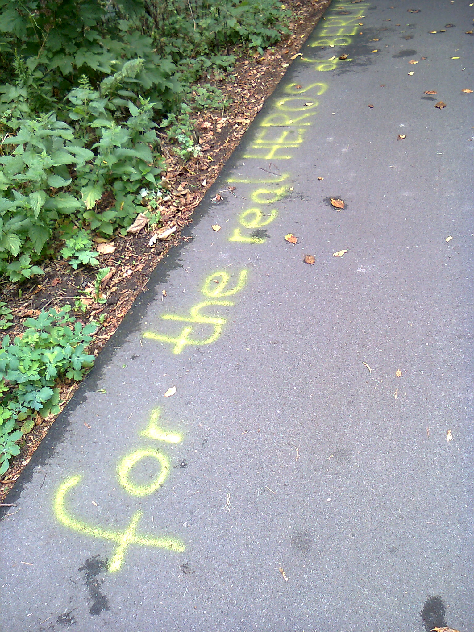 Laut meiner Laufuhr hatten wir da gerade einen Zwischenspurt eingelegt und ohne ein eigenes Lämpchen war ich ja eh mehr nach Gehör unterwegs......den hübschen Spruch hab ich da leider nicht gesehen. Oder ich war da mit Matthy gerade zu heftig am Sabbeln![]()