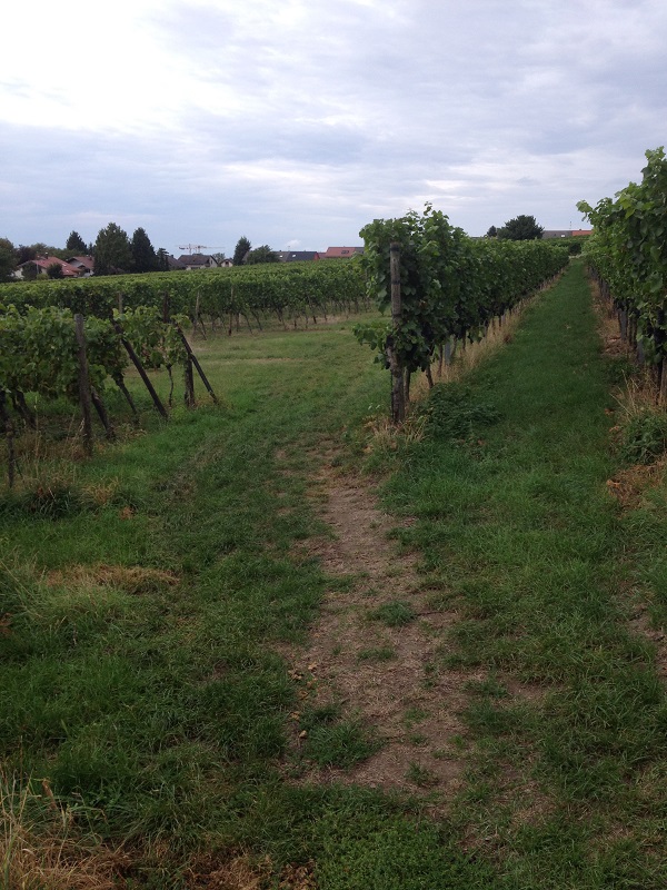 Faszinierend was sich manche Leute in ihren Garten bauen. Über Trampelpfade zwischen den Weinreben hindurch...