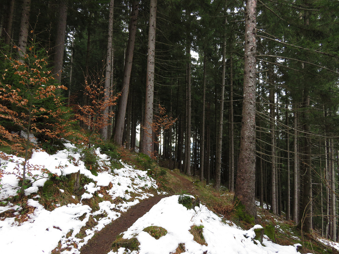 Heute früh geriet ich unverhofft in eine Wurzelbehandlung ... daraufhin war die Laune zum Laufen nicht ganz so da, aber für einen Spaziergang hat's gereicht. Die Neuschneemengen sind, wie schon erwähnt, extrem überschaubar, aber so ab 1000m Seehöhe hat man zumindest eine Andeutung von Winter: