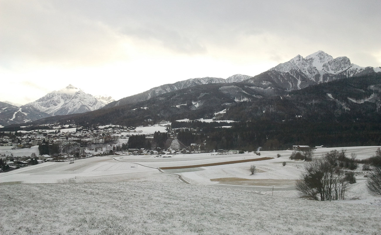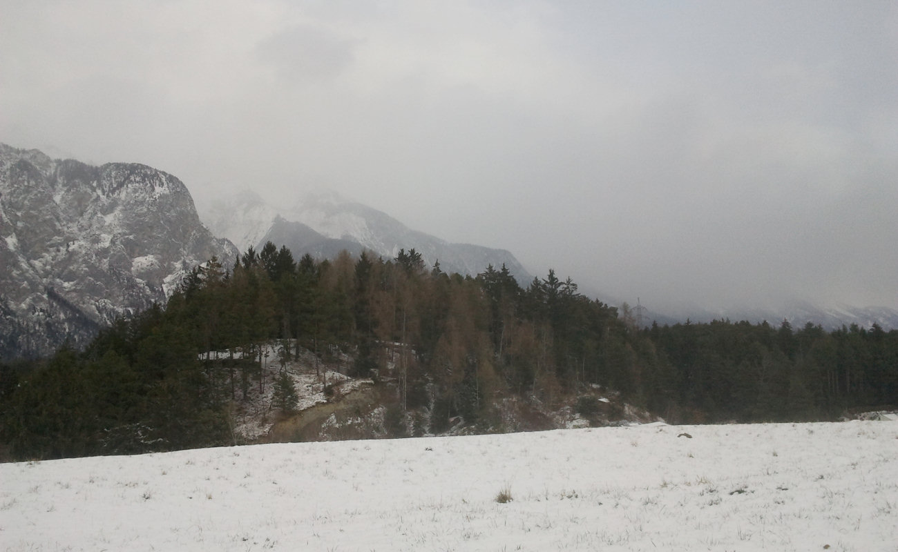 Heute ein Lauf in den Westen, das Foto zeigt den Blick aus dem "nassen Tal" über Völs zum Flughafen ... die Nordkette im Hintergrund steckt in Schneewolken, aber die Schneemengen sind eher bescheiden