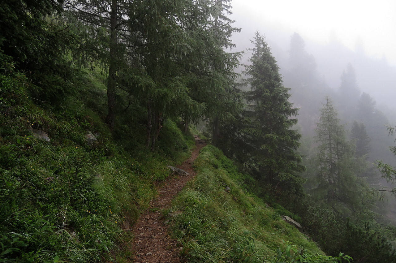 Dank frühen Starts angenehmes Aufstiegswetter im Nebel: Knapp oberhalb von 2.000m die imposanten "Stoamandelen" oberhalb der Alm, da gab's Jause und eine traumhafte Morgenstimmung:
