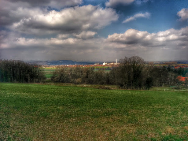 .. und wieder aus dem Wald raus, bei Heyersum. Im Hintergrund die Zuckerfabrik Nordstemmen und Schloß Marienburg.