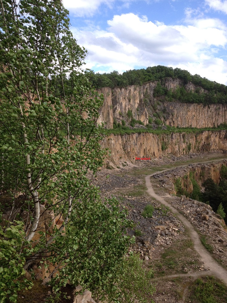 Etwas später führte der Weg dann am Rand eines alten Steinbruchs - jetzt ein Kletterpark - vorbei. Die Dimension ist leider schwer zu erkennen. Ich hab mal versucht im Bild die Größenunterschiede aufzuzeigen.