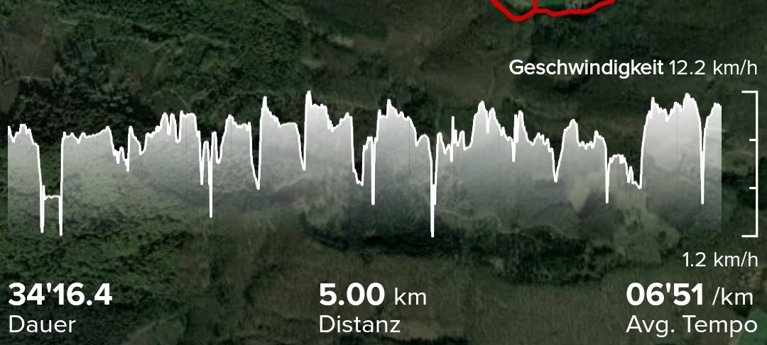 Heute hat er sich selbst übertroffen, fast 80m Höhendifferenz auf 5,2km waren zu überwinden, die Lufttemperatur betrug 28°C. Auf dem zweiten Kilometer waren über 50m Höhendifferenz zu überwinden, deshalb gab es den Abfall der Geschwindigkeit von Belay. Ansonsten lief er konstant, teilweise mit seinen obligatorischen kurzen Gehpausen und in einer Geschwindigkeit, die er noch nie zuvor über diese Distanz gelaufen ist. Da geht noch was.