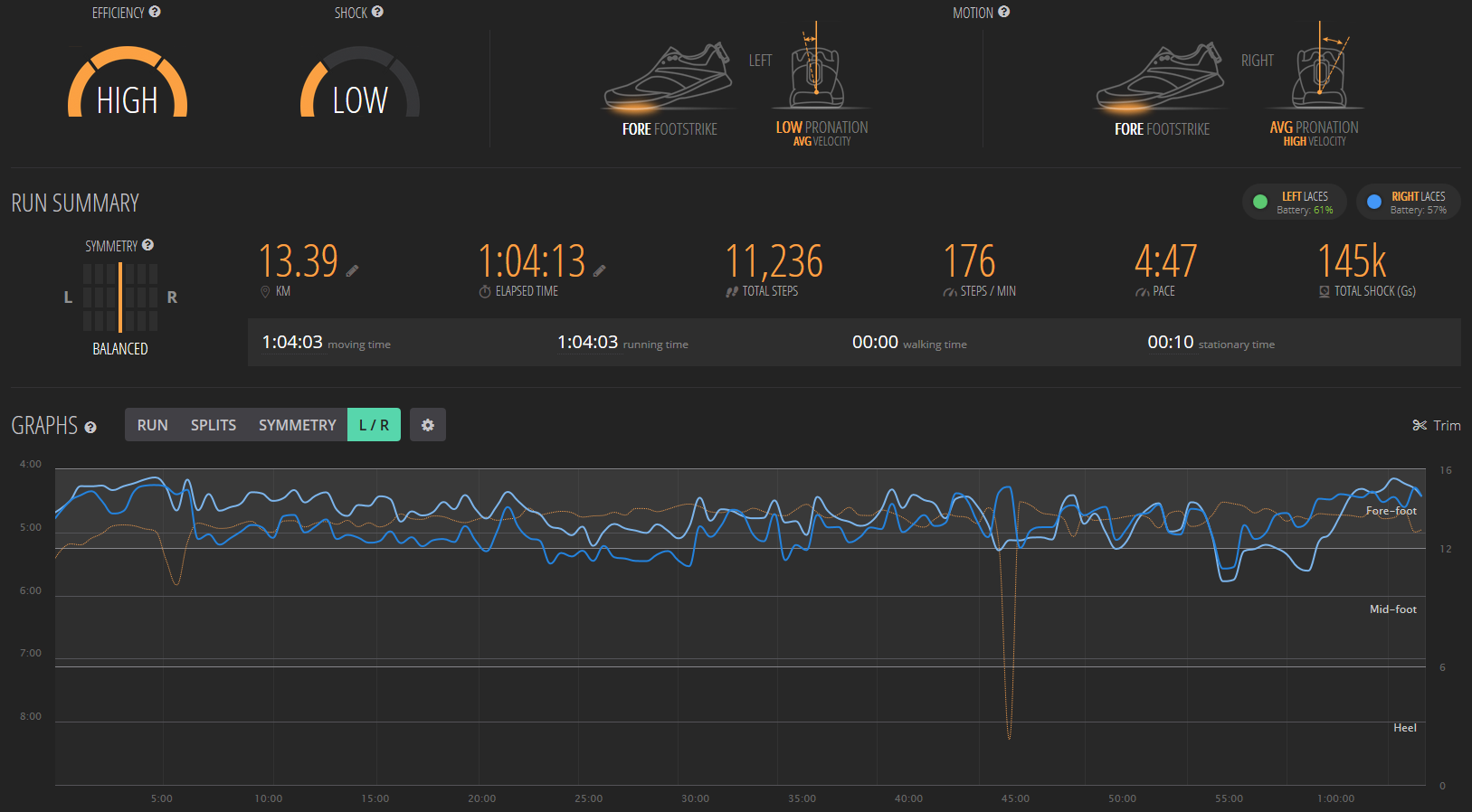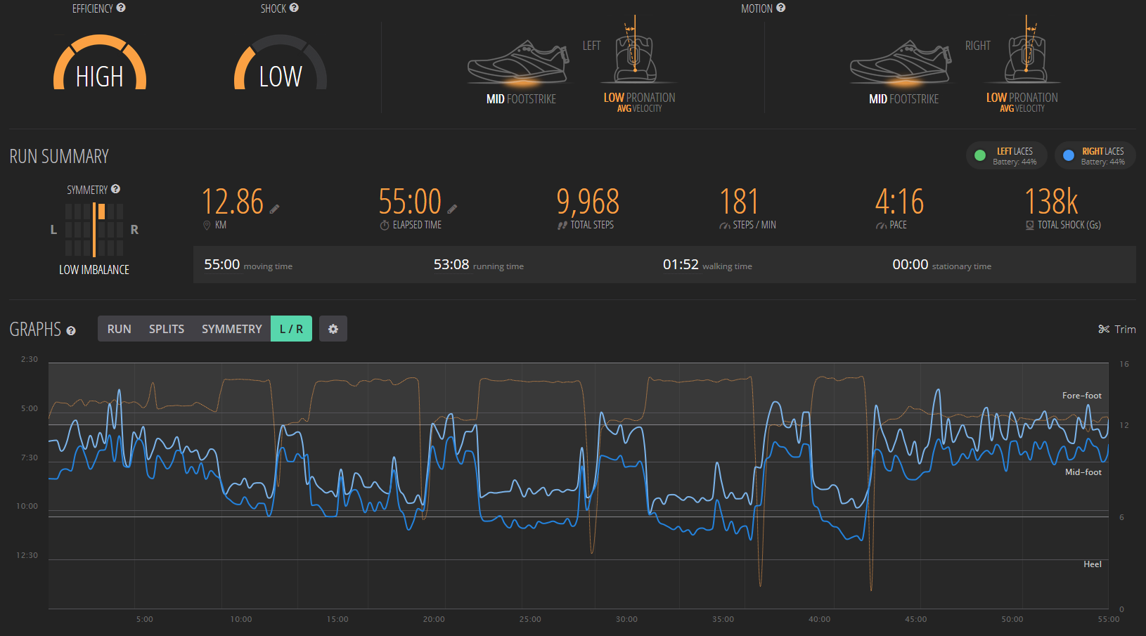 Ich laufe stärker über die Ferse, wenn ich schneller werde. Hier ganz schön mit den Runscribe+ bei Intervallen sichtbar. Gepunktete Linie ist die Pace. Hellblau ist links, dunkelblau ist rechts. Dazu sieht man auch meine Asymetrie rechts (dunkelblau), welche man auch dem Abrieb der Sohlen ansieht mit stärkerem Abrieb an der Ferse: Richtig arg wird es, wenn ich dann gezielt langsam laufe: Keine Ahnung. Macht aber auch nix.leviathan hat geschrieben: Ich laufe alle Tempi über die Ferse. Die normalen Dauerläufe, MRT oder auch schnellere Sachen bekomme ich (leider) gar nicht über den Vorfuß hin.