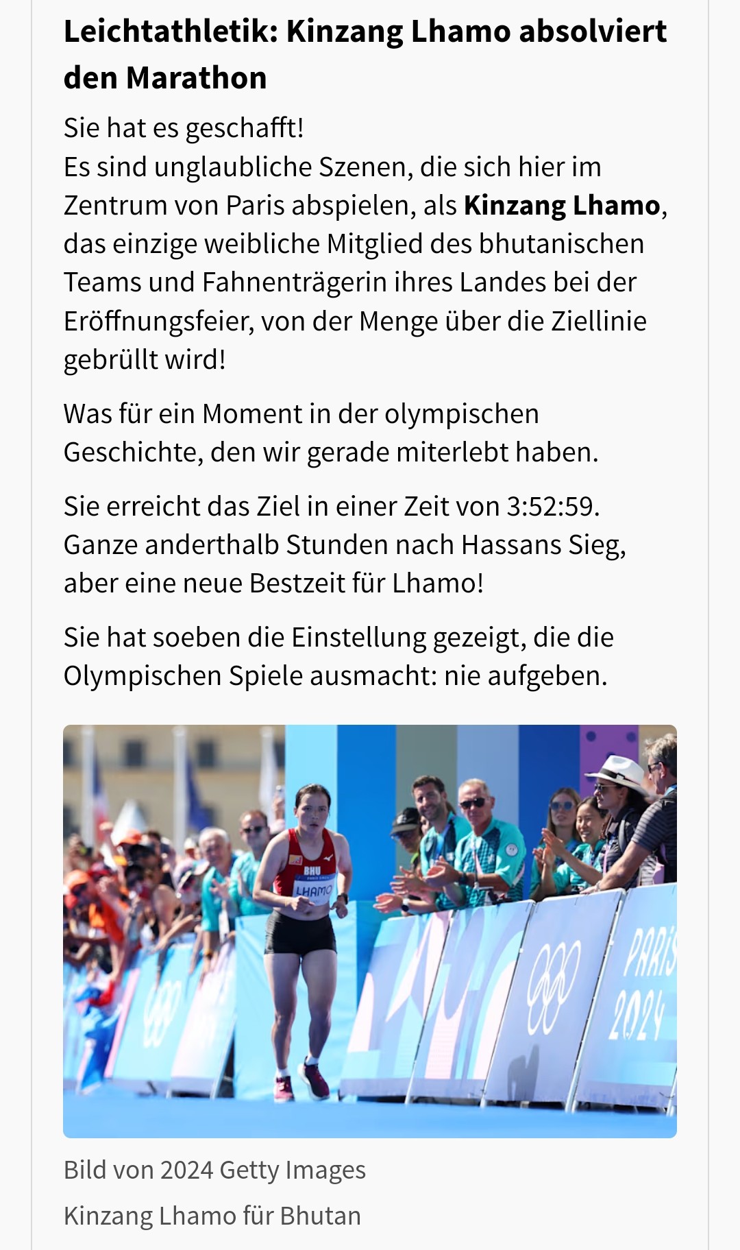 8Es gibt ja eine internationale Norm von 2:26:50 für alle Athletinnen. Die nationalen Verbände können diese natürlich NIEDRIGER legen. In diesem Fall hat Bhutan eine "Sondereinladung" bekommen, wie so manch anderer Staat. Die Bestzeit vor Paris war bei der Dame übrigens bei 3:26. Also keine neue Bestzeit.