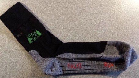 Abfahrt 7 Uhr, traumhafte Anreise (1h), zu Hause noch Bodennebel, durch das Dreisamtal bei Morgenröte, durchs Höllental bei null Verkehr (sonst die Hölle). Auf der Baar dann Hochnebel, aber 10°C und trocken. Super Bedingungen, die bis ins Ziel anhalten werden. Parkplatz gibt es keine 5 Min von der Sporthalle entfernt. Ich hole mir die Startnummer 100 ab, die man mir auf meinem Wunsch hin vergeben hat und ein paar F*lk*-Socken, die im Startgeld inbegriffen sind. Die Socken haben das Schwarzwald-Marathon Logo eingewebt (siehe unten). Sowas gibt es nicht überall, die stehen bei uns hier hoch im Kurs