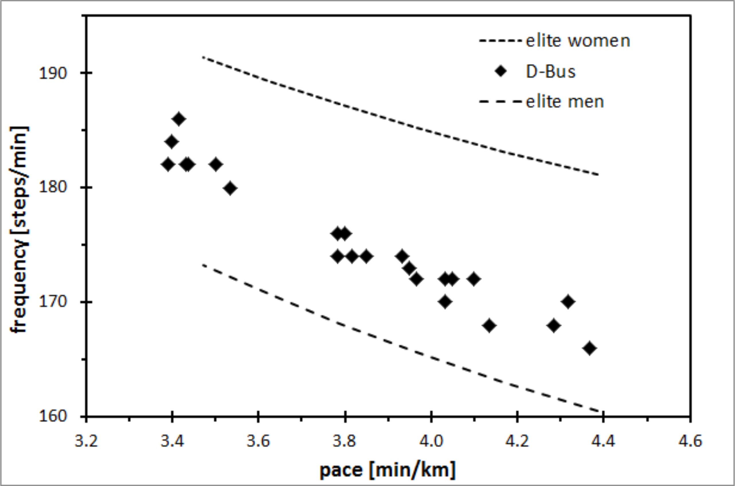 Interessant! Ich hätte gedacht, dass die Frequenz viel konstanter ist und nicht proportional zur Pace verläuft, sondern dass die Pace eher über eine größere Schrittlänge gemacht wird. Meine Messungen waren bisher nur durch tatsächliches Zählen ein Foot-Pod ist da natürlich objektiver.