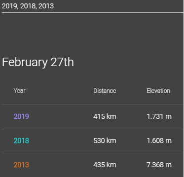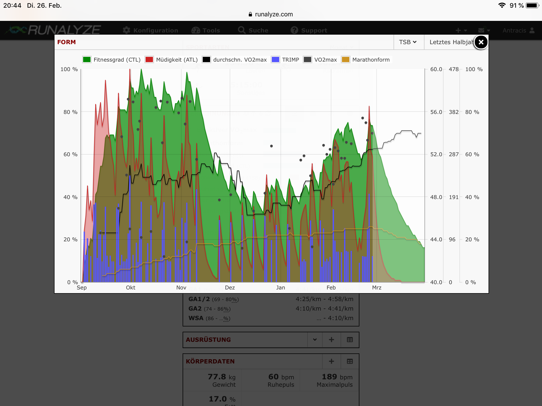 Ansonsten ist Runalyze der Ansicht, das ich wieder halbwegs die Vo2max-Bereiche vom Oktober habe. Der Haken ist nur, dass da jede Woche eine Einheit im Oktober mit Bergsprints und 2-3min Stehpause drin ist und da der Import nachträglich war, ist das nicht rausgenommen. In Wirklichkeit bin ich also deutlich schlechter unterwegs, als im Herbst und selbst da war das Niveau ja Saisonbeginn. Aber was solls, die Richtung stimmt. Jetzt werd ich langsam die Länge der Einheiten ausbauen und etwas Speed reinbringen.