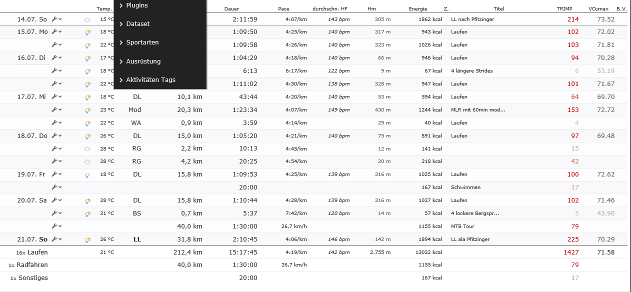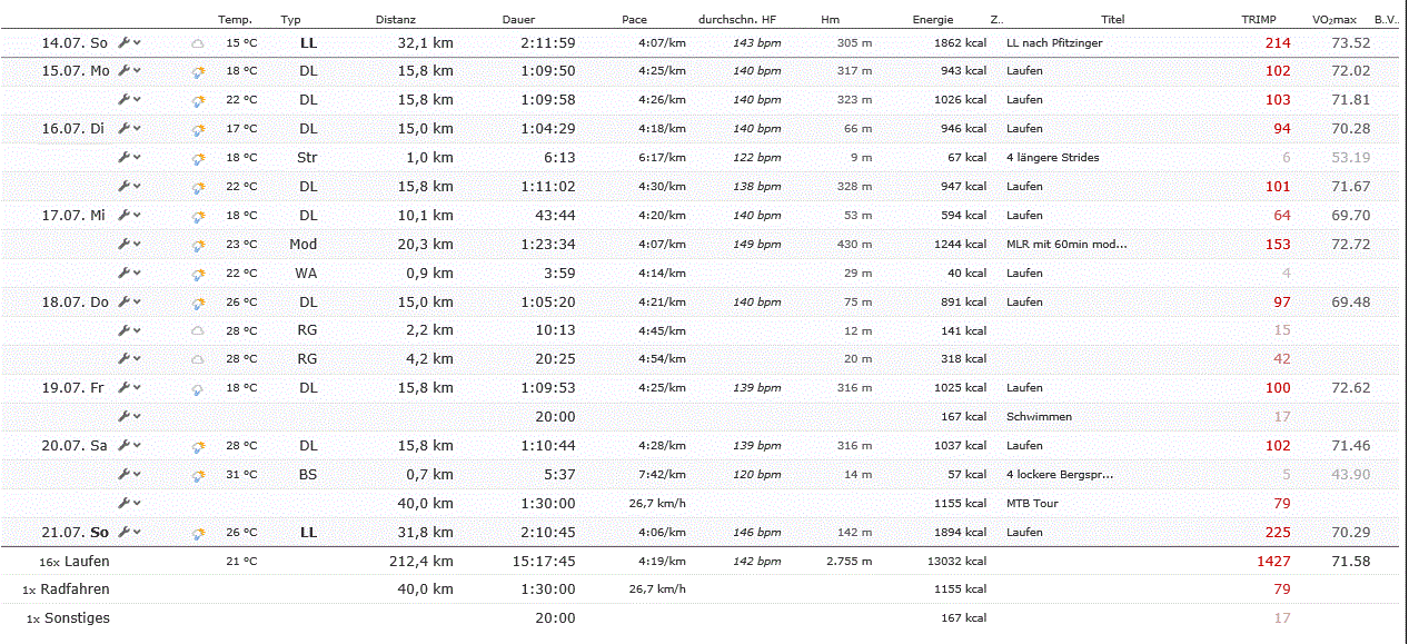 @Jens: Wieder eine schöne Woche, aber die HF ist krass bei dem Hitzelauf. Hat zwar nix mit der Form zu tun, kostet aber dennoch vermutlich fast soviel Körner, wie wenn Du 35km @MRT gelaufen wärst. Würde ich mir nicht allzu oft in dieser Vorbereitung mehr zumuten.