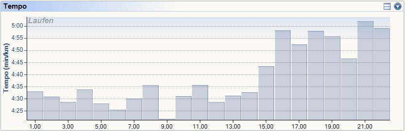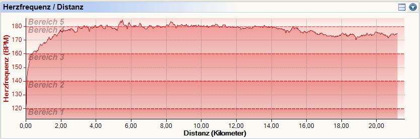 Die Grafik ist vielleicht nicht soo aussagekräftig, weil der Kurs leicht wellig war (aber keine schlimmen Steigungen). Gefühlt bin ich bei km 14 eingebrochen. Obwohl es im Ziel wieder ging, konnte ich auch kein Tempo wieder aufnehmen - da hat dann der "Central Governor" wohl zu gemacht;-). Das sieht man auch sehr schön an der Pulskurve, die fällt zum Ende hin ab. Wohl auch ein deutliches Zeichen, dass ich einfach zu schnell gestartet bin: