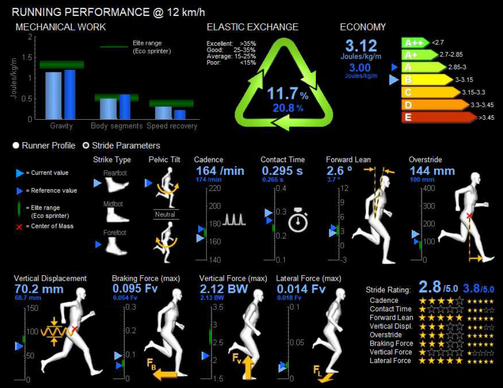 Also habe ich dann doch mal einen Termin ausgemacht und mich auf's Laufband gestellt. Die meisten Erkenntnisse sind nicht wirklich neu, aber trotzdem seht interessant das mal objektiv gemessen zu sehen. Meine größten Baustellen sind wohl definitiv mangelnde Körperspannung und mangelnde Sprungkraft, was zu einer miserablem "elastic exchange" Wert führt. (Übertrieben ausgedrückt) komme ich letztlich zu weit vor meinem Körperschwerpunkt auf, sacke wie platter Ball in mich zusammen, verliere dabei einen Großteil der Energie, und mache abschließend aus der Hocke einen großen Sprung nach vorne. Das korreliert auch ganz gut mit meiner unterdurchschnittlichen Schrittfrequenz und sehr langen Bodenkontaktzeit. Ein weiterer - auch stark damit zusammenhänender Punkt - ist, dass ich wohl nahezu ausschließlich mit meinen Kniestreckern (vordere Oberschenkel) laufe und meine Kniebeuger (hintere Oberschenkel, hamstrings) so gut wie gar nicht einsetze. Auch das korreliert ganz gut mit meinen üblichen Muskelkater nach Marathons.