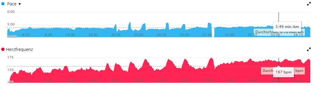 Mi: 5,55 km @6:16 + 3 Steigerungen a ca. 60-80m