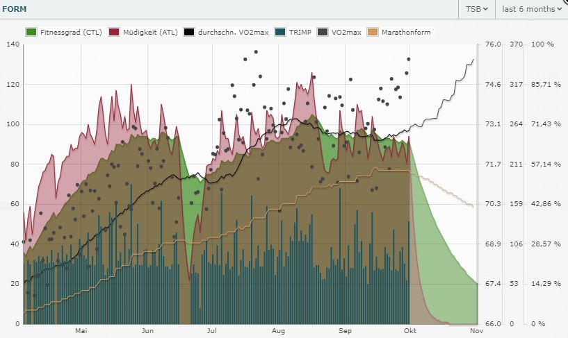 Gute und tiefgehende Fragen von Dir... Rausgenommen habe ich nur beim Laufen. Meine Trainingszeit pro Woche hat im September ein neues Allzeithoch erreicht. Weil die Intensität niedriger ist, hat der CTL nur den zweithöchsten Wert ever. Den höchsten CTL hatte ich in der Valencia Vorbereitung letztes Jahr. Aber warum ich beim Laufen rausgenommen habe weiß ich auch nicht so recht.