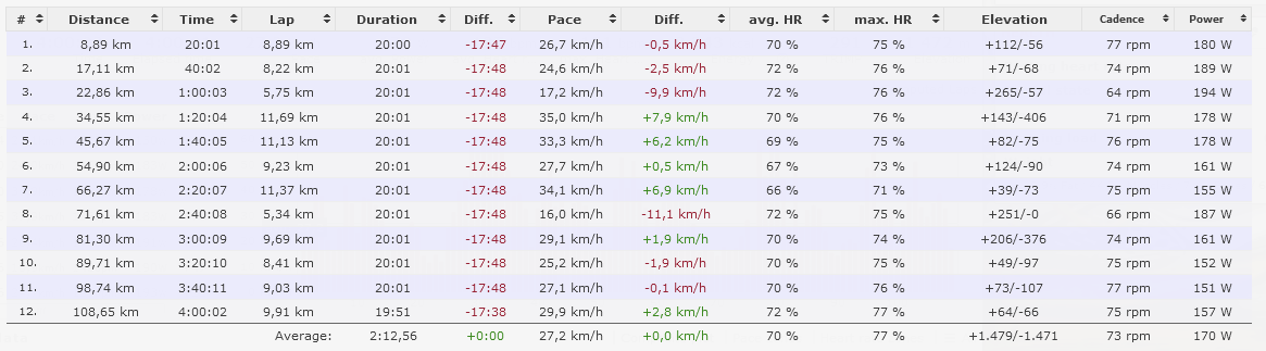 Neben den Pinkelpausen ist der Drift auch erkennbar. Allerdings habe ich gegen Ende auch mehr Gas gegeben um schneller fertig zu werden und die Kohlenhydratvorräte waren auch aufgebraucht.