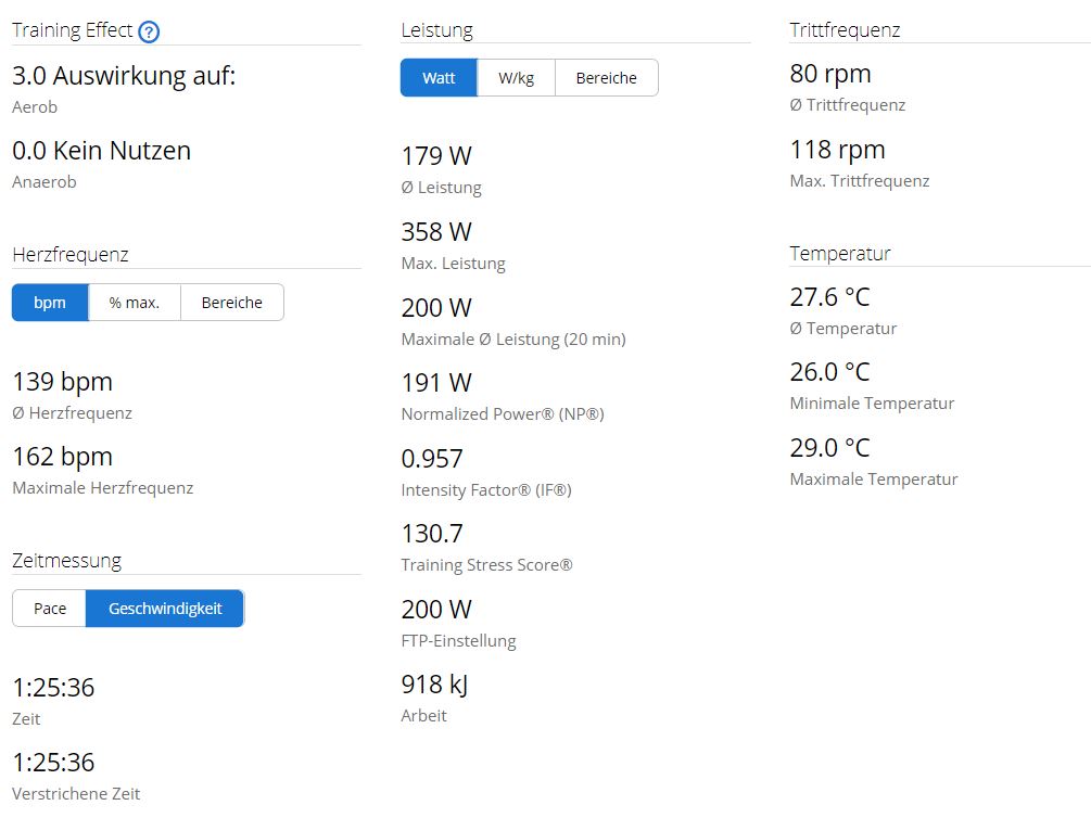 | So: | Rad | 72.9km @28.1km/h (561HM) 2:35:30min @180W / 198W NP |