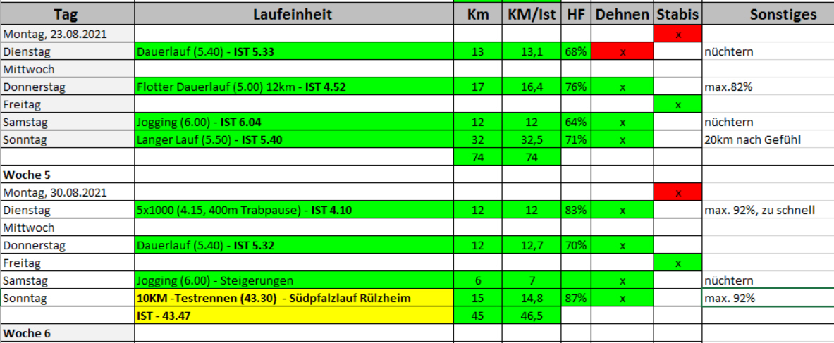Diese Woche gibt's nur noch am Dienstag eine harte Einheit (5x1'000 im 10k RT). Ansonsten werden die Einheiten kürzer als letzte Woche.