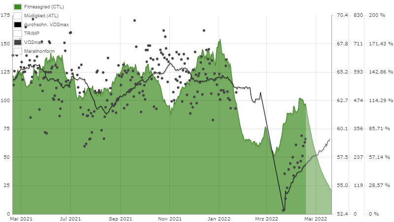 @Levi: Das Timing ist natürlich denkbar blöd. Ich versuche trotzdem das Positive zu sehen: Die nicht optimale Kontinuität hat Dir doch eindrucksvolle 10 VO2-Max-Zähler spendiert und Du oszillierst auf hohem Niveau. Das hört sich jetzt nicht nach einer langen Geschichte an, die natürlich andererseits zum denkbar ungünstigsten Zeitpunkt kommt. Dennoch: Das Trampolin, von dem Du Dich zum nächsten Wettkampf abdrücken kannst, hat eine eindrucksvolle Vorspannung. Ich bin da optimistisch, zumal es ja nur wenige Wochen wettkampfspezifität brauchen wird.