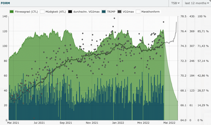 Sollte sich das zeitweise leichte Ziehen von gestern bei der Arbeit in einen leichten Schmerz verändern (der länger als sagen wir 15 Minuten anhält), werd ich vorsichtiger sein, anpassen, ggf. den Marathonversuch abbrechen (Urlaub hab ich dann eh 2 Wochen und könnte danach ja auch wieder ne Phase mit Miniumfängen machen (bisher hab ich mich zum Glück verletzungsmäßig noch nie dauerhaft schwer abgeschossen, bin aber natürlich sicher auch nicht davor ganz gefeit). Dann denke ich halt, man weiß nicht, wie die Coronasituation im Herbst oder nächstes Jahr ist oder wie sich die Weltlage im Allgemeinen entwickelt. Wenn ich jetzt erstmal noch einen einigermaßen soliden Marathon schaffen könnte, wärs nicht schlecht. Die Form scheint gut zu kommen und da möchte ich versuchen, die Chance zu nutzen. Aber immer im Hinterkopf, dass es möglicherweise gar nix wird..