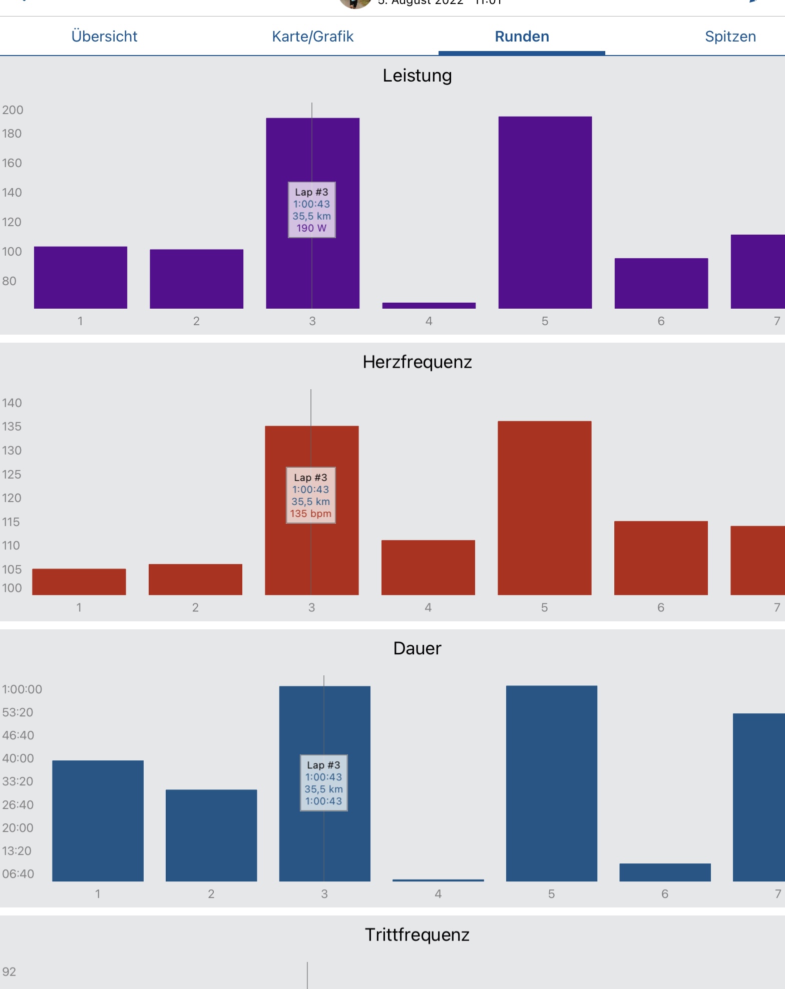 | Mi: | Laufen | 12.3km @4:53/km mit 7x[5' @~3:52/km + 2:30' Pause] |