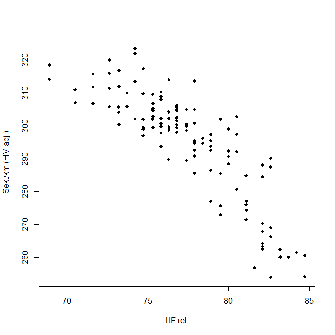 Für mich sieht das ziemlich linear aus (r^2=0.728) . Mir ist klar, dass es bei höheren Herzfrequenzen (fehlen mangels WKs) oder deutlich langsameren Läufen sich verändert, aber im Bereich von 75-85% ist das erstaunlich stabil.