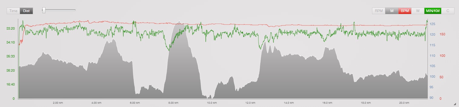 Ich weiß gar nicht mehr genau, wann ich die Gruppe ziehen lassen musste, spätestens jedoch am ersten längeren Anstieg bei km4 rum. Da lag ich dann auf Platz 4. Danach war ich für den Rest des Rennens praktisch auf mich allein gestellt. Hat diesmal aber besser funktioniert als beim 10er. Keine Motivationsprobleme gehabt. Ein Läufer zog mal an mir vorbei, den konnte ich aber wieder kassieren. Bei km 16 überholte mich ein anderer Läufer mit deutlichem Geschwindigkeitsüberschuss. Im Ziel hatte der dann auch fast 1min Vorsprung rausgelaufen.