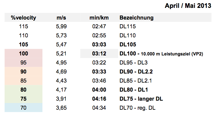 Also auf der Bahn mag es ja noch möglich sein, eine bestimmte pace auf 15s oder sogar 7s genau einzuhalten. Im Wald oder auf der Strasse braucht nur ein Anstieg zu kommen....aecids hat geschrieben:PS: Als Anhaltspunkt für die Tempoberechnung nachfolgend noch eine Tabelle. Dort sind verschiedene Tempi, welche sich prozentual an dem 10.000 Meter Wettkampfziel orientieren, aufgeführt und zugleich die verschiedenen "üblichen" Berzeichnungen angegeben. DL95(+/- 2) entspricht dabei in etwa dem Schwellentempo, DL105 dem 5-Kilometer-Wettkampftempo.