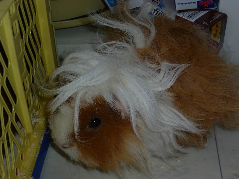 Auf dem Foto sieht man es nicht ganz, sie sieht aus wie ein Langhaarmeerschweinchen, dem man an manchen Stellen die Haare kurz geschnitten hat und die verfilzt sind, sie ist nicht überall langhaarig, an diesen Stellen sieht man das typische Teddymeerschweinchenfell (heißt tatsächlich so, das Fell ist so krisselig), die langen Haare sind glatt.