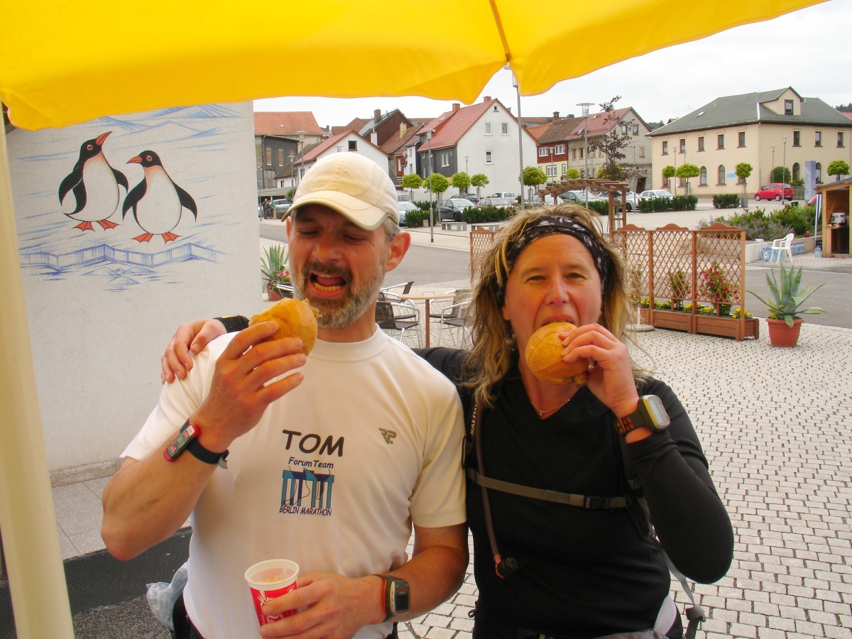 Meine Bratwurstpremiere hatte ich ja beim Thüringen Ultra 2011. Da stand nur paar Meter neben einem VP ein Bratwurststand. War ungefähr bei Kilometer 70 oder etwas später. Und das duftete! Ich überlegte noch hin und her. Da kam die gute Conny Kaltwasser des Wegs und hatte das gleiche Problem wie ich :hihi: Da waren wir zwei uns schnell einig und teilten uns eine Wurst :daumen: