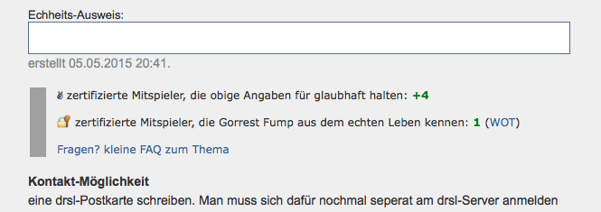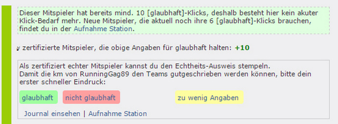 Klick auf Deinen Namen, dann "Kontakteseite" dann "journal einsehen" ... da siehst Du, wer Dich für glaubhaft gevotet hat und wieviele Du insgesamt hast (hinten die grüne Zahl). Wenn Du nachher auch stimmberechtigt bist, findest Du die Neuen, die noch freigeschaltet werden wollen, unter der Karte "unserer" Mannschaft. Alle Freizuschaltenden findest Du in Deinem Hauptmenü, wenn Du oben kmspiel.de anklickst! Einfach mal ein wenig mit der Seite geschäftigen!Gorrest Fump hat geschrieben:Wo sehe ich denn wie viele Stimmen ich noch benötige?