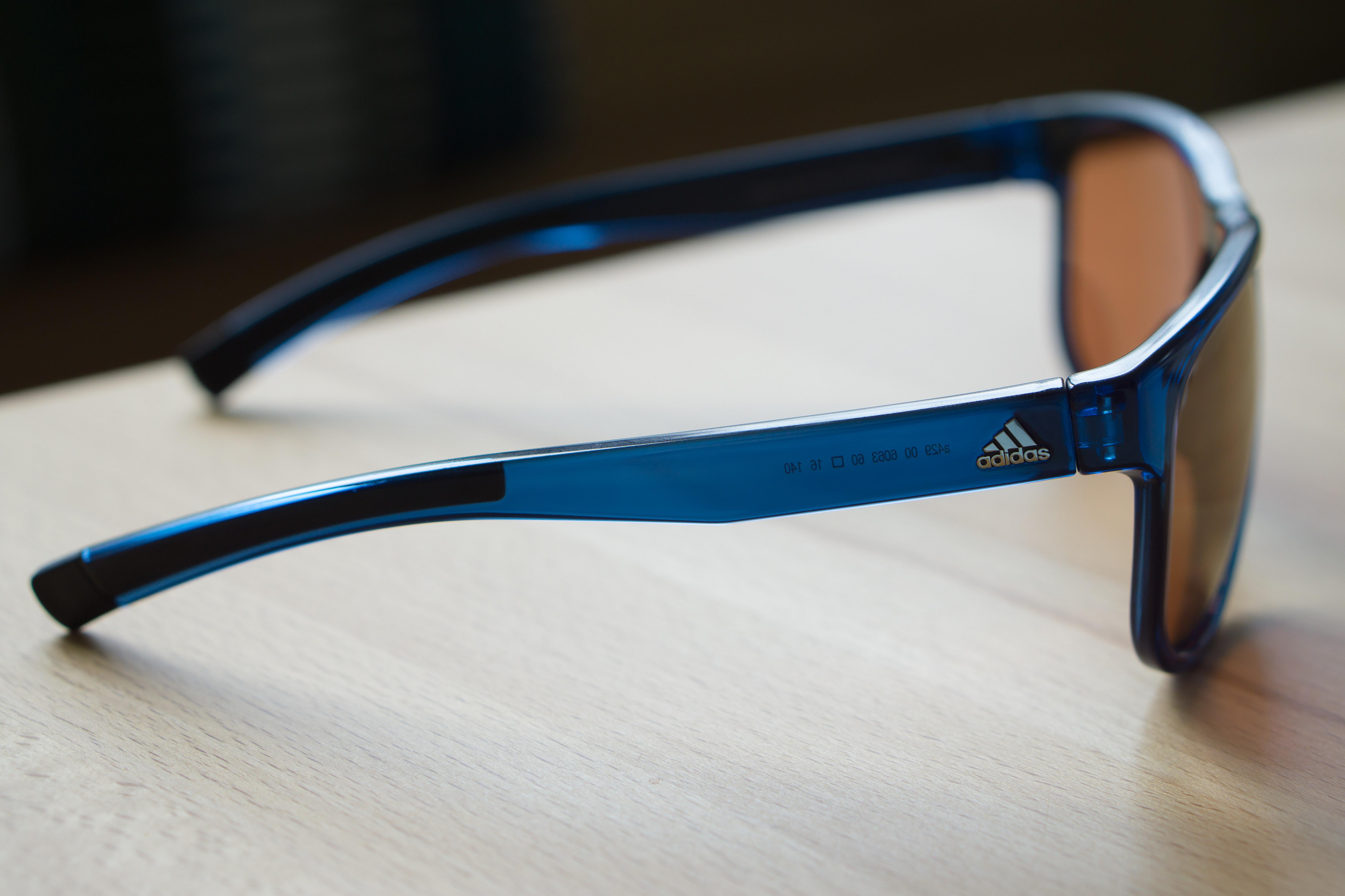 An der Außenseite der Bügel, die sich gut bewegen lassen und auch beim Bewegen der Brille nicht wieder einklappen, ist das bekannte Logo von Adidas in Chrom abgebildet. In der Innenseite gehen die Bügel zum Ende hin vom blauen Kunststoff zu Gummi über, um einen festen Halt zu gewähren.