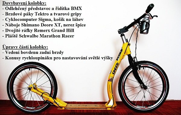 Ja, die hintere Bremse muss sein. Vielleicht ist auch eine Magura-Bremse hinten interessant, um die Verluste durch die lange Bremszughülle zu vermeiden. Bei 20/20 möchte ich einen steileren Lenkwinkel (~75°) nehmen, so dass der Roller kompakter wird, natürlich dann mit spezieller Gabel. Damit braucht man dann auch nicht so extrem lange Vorbauten, weil das Steuerrohr oben mehr Abstand zum Körper behält. Die Lenkerposition sollte noch ähnlich wie bei einem Kickbike möglich sein. Der 20/20-Gedanke war jetzt nicht meine Idee, aber er gefällt mir. Wäre ein bisschen Wiederbelebung dieser Kombination :) . Schaun mer mal. Ich finde es nicht nötig, bei einem 20"-Vorderad ein noch kleineres Hinterrad zu nehmen.