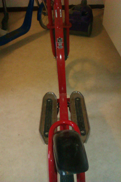 Ja, mein Lieber! Du hast da ein wertvolles Teil ergattert. Es ist aber kein Tretroller. Du siehst, das Hinterrad ist exzentrisch. Das hat nichts mit den vorderen Exzenterradkränzen vieler High-Tech Rennräder zu tun. Es ist viellmehr ein Exzenterroller. Du stößt dich ab und dann wackelst du mit dem Arsch auf die richtige Weise und dank des Exzenters wirst du nie wieder mit den Füßen den Boden berühren müssen, um vorwärts zu kommen.