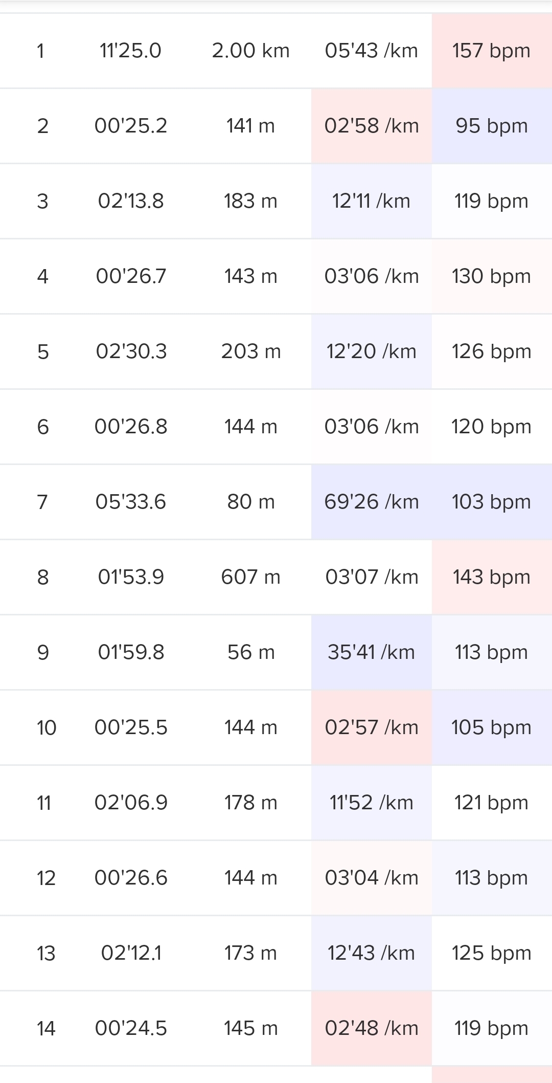 Die 1600m waren sehr hart. Einerseits wohl, da es die längste Distanz in dieser Pace seit Wiederbeginn war, andererseits ist der erste Teil der Strecke etwas hügelig, was mir überhaupt nicht liegt.
