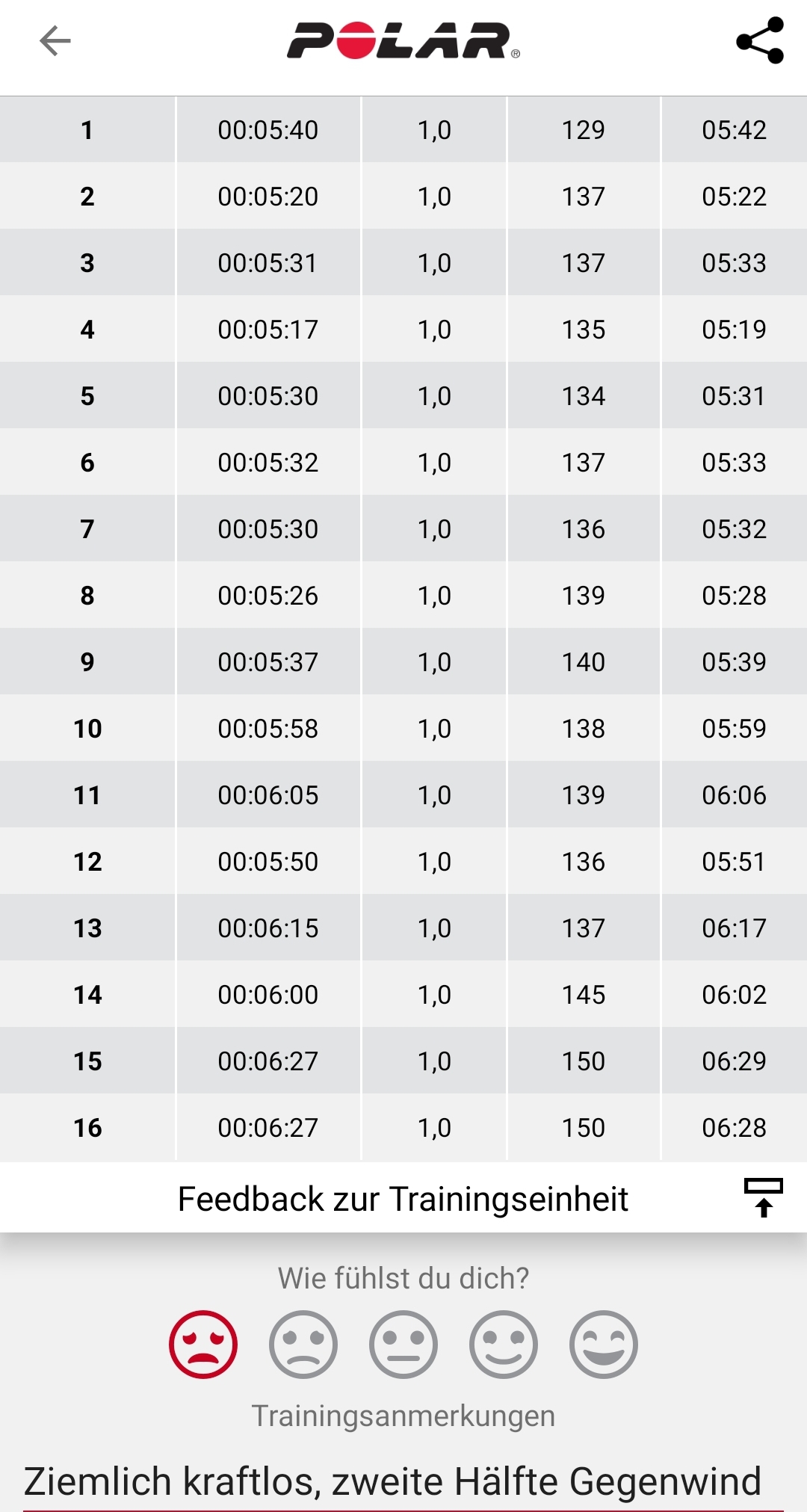 Tempo bin ich nach Gefühl gelaufen, wobei ich bei den Trabpausen etwas darauf geachtet habe, zum Ende hin nicht immer langsamer und langsamer zu laufen.