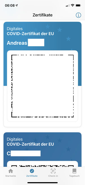Damit man sich das vorstellen kann: Oben ich, Zwei Impfungen aber kein vollständiger Schutz, unten meine Frau, vollständiger Schutz.ruca hat geschrieben:Und um der Dämlichkeit die Krone aufzusetzen: In der aktuellen Version der Corona-Warn-App für iOS sind die Zertifikate für 2. Impfung und für 2. Impfung +14 Tage auf den ersten Blick kaum unterscheidbar, Name + QR-Code umrandet von einem blauen Feld, kein ergänzender Text. Einziger Unterschied ist ein leicht unterschiedlicher Blauton, der bei unterschiedlichen Displays und Lichtverhältnissen nur im direkten Vergleich auffallen dürfte.