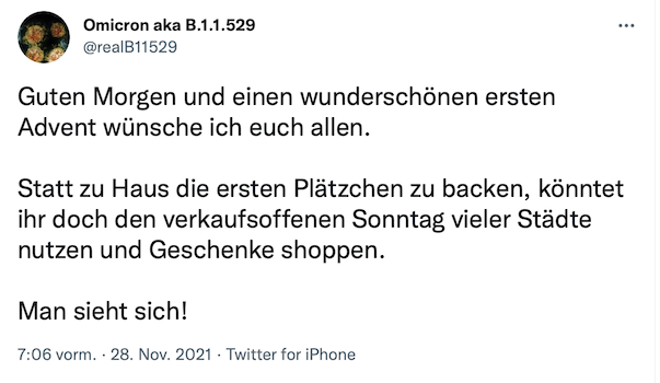 Ja, das ist nicht überraschend. Omicron hat auch bereits einen eigenen Twitter-Account und erzählt von seinen Erlebnissen bei uns im Land. Sehr unterhaltsam.ruca hat geschrieben:Omicron ist schon seit Wochen bei uns