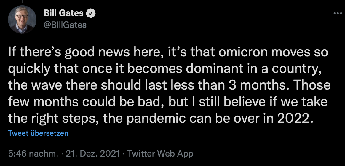 Das teile ich partiell. Als die ersten groben Studienergebnisse aus SA kamen, war ich auch eher neutral. Da gab es bereits eine ziemlich passable Immunisierung durch natürliche Durchseuchung und Impfung. England sollte hier eher vergleichbar sein. Die Definition des Maximum ist allerdings auch eine schwierige Angelegenheit. Ich habe immer noch die Kernaussage zu Beginn der Pandemie vor mir:Ansonsten hat mich primär der Wiederholungsfehler gewundert, denn ähnliches hat man auch Delta zugeschrieben. Und das "jetzt haben wir das Maximum erreicht" ebenfalls. Komisch das diese Lehrstunden der nahen Vergangenheit da immer so schnell vergessen werden. Klar, Herr Gates ist kein Virologe, aber ich hätte da mehr von ihm erwartet, da es ja quasi ein Rechenprozess bzw. eine Informationsintegration ist, was dann nichtmehr so weit von seinem Feld weg ist.