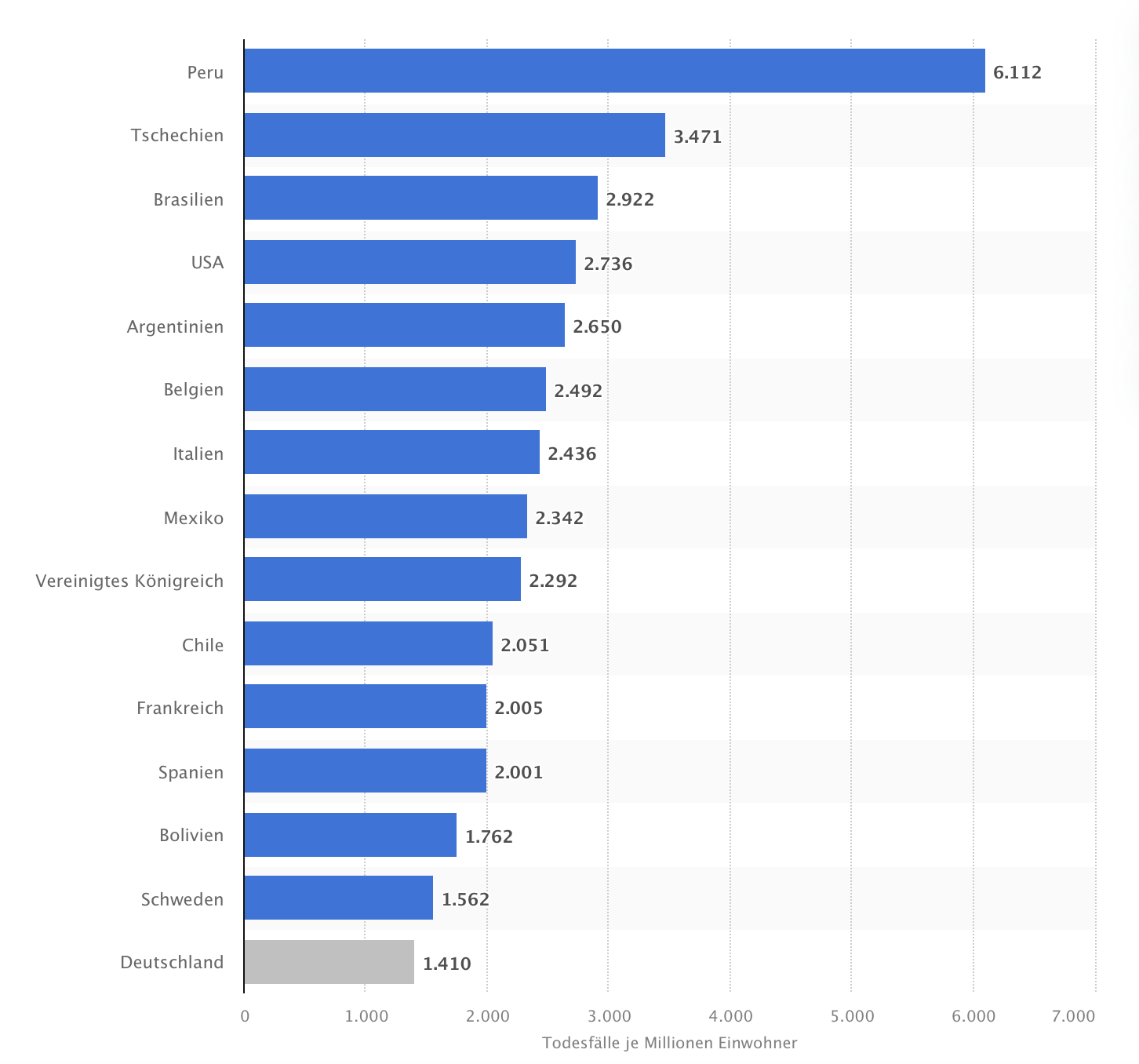 Schweden wird immer gern von uns kritisiert, weil man so ein übles Corona Management hat(te). Hauptkritikpunkt sind dabei die hohen Todesfallzahlen. Hier mal eine Auswahl ausgewählter Länder (Quelle: statista):