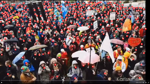 Ich habe mal einen Screenshot aus dem Video gemacht und mit "Greenshot" alle sichtbaren Personen markiert. Der Counter endete bei 367 [edit] 369, unten rechts in der ersten Reihe fehlt die gelbe Mütze und die Person daneben) [/edit]- und da fehlen noch viele, die von Regenschirmen, Transparenten, Flaggen, Lautsprechern oder anderen Personen verdeckt sind, zudem zeigt der Bildausschnitt nicht alle und besonders hinten fehlen etliche aufgrund der Auflösung.
