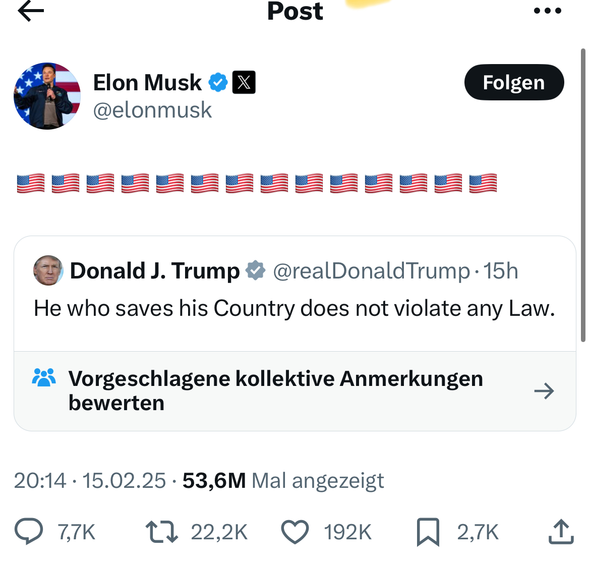 Wir sollten uns langsam aber sicher mal mit dem Gedanken befassen, dass Europa jetzt der Führer der freien Welt sein muss. Mit allen Konsequenzen, die da dranhängen. Natürlich nicht ohne unsere verbliebenen Freunde in den USA zu vergessen, die unter diesem faschistischen Regime leiden.