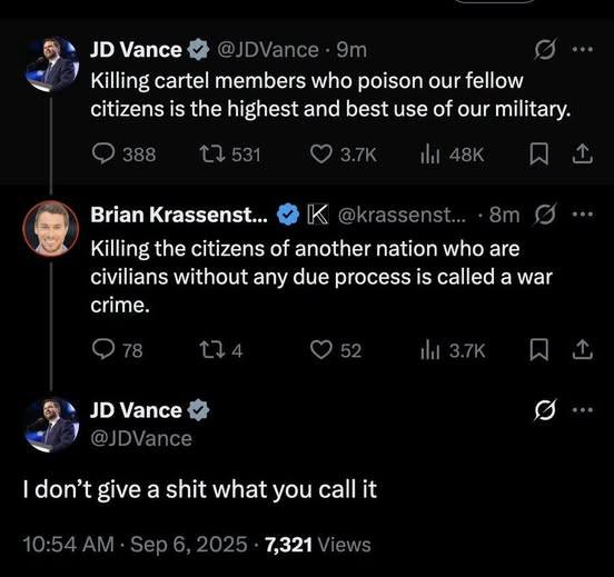 37741Das Anzetteln eines Bürgerkriegs gilt als Landesverrat und dafür ist die Höchststrafe der Tod. Der Einsatz des Militärs gegen die eigene Bevölkerung ist illegal. Solche Details scheinen die Autoren aber nicht zu verstehen oder zu ignorieren.ruca hat geschrieben: 07.09.2025, 09:40 "PR" dafür, nur noch Trumps Leute zu wählen, ansonsten gibt es einen Bürgerkrieg.